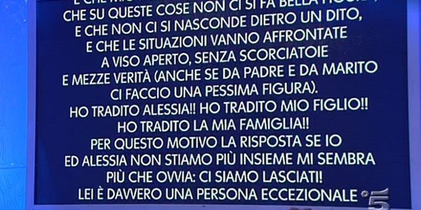 La De Filippi manda sul led il filmato di Aldo Palmeri e di Alessia Cammarota; successivamente la conduttrice manda il messaggio scritto da Aldo per i fans nel quale specificava che la loro storia era finita perchè aveva tradito Alessia. La Cammarota entra in studio visibilmente dimagrita e la De Filippi glielo fa anche notare. La ragazza rivela che per il momento l’appetito non c’è e che per il bene del bambino hanno deciso, in qualità di genitori di vivere a Catania. Entra anche Aldo il quale rivela che è dispiaciuto per come sono andate a finire le cose sostenendo che al momento del matrimonio il sentimento c’era. La situazione è andata peggiorando per la vita frenetica, ma soprattutto per l’incompatibilità di carattere. Alessia, in lacrime, sostiene che quando litigano si offendono pesantemente, ferendosi così a vicenda. Gianni Sperti chiede ad Alessia se è ancora innamorata di lui e lei risponde che è la sua metà, aggiungendo che però molto probabilmente non vale la stessa cosa per lui. La Cammarota spera che un giorno tutto si sistemi, mentre lui ha già capito che non ci sarà più un futuro per loro.