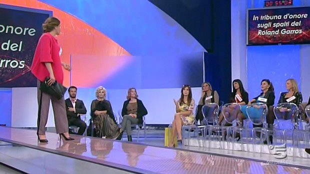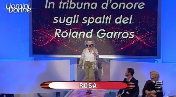 Lo studio di Uomini e Donne ora si trasforma in una passerella per sfilate. Sfilano sei donne e il tema è ” “Sugli Spalti al Roland Garros”. Sfilano Barbara, Gemma, Erminia, Elga, Lisa e Rosa.